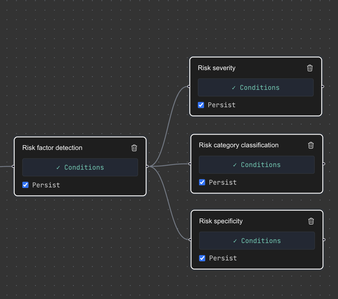 Workflows are DAGs of operators that define your full analytical flow. Go beyond single-step extraction: identify relevant sections of a document, segment them, run specialized analysis on each segment, call market data tools, benchmark results. Workflows trigger automatically when new data arrives or run on demand. The entire pipeline is versioned and auditable.